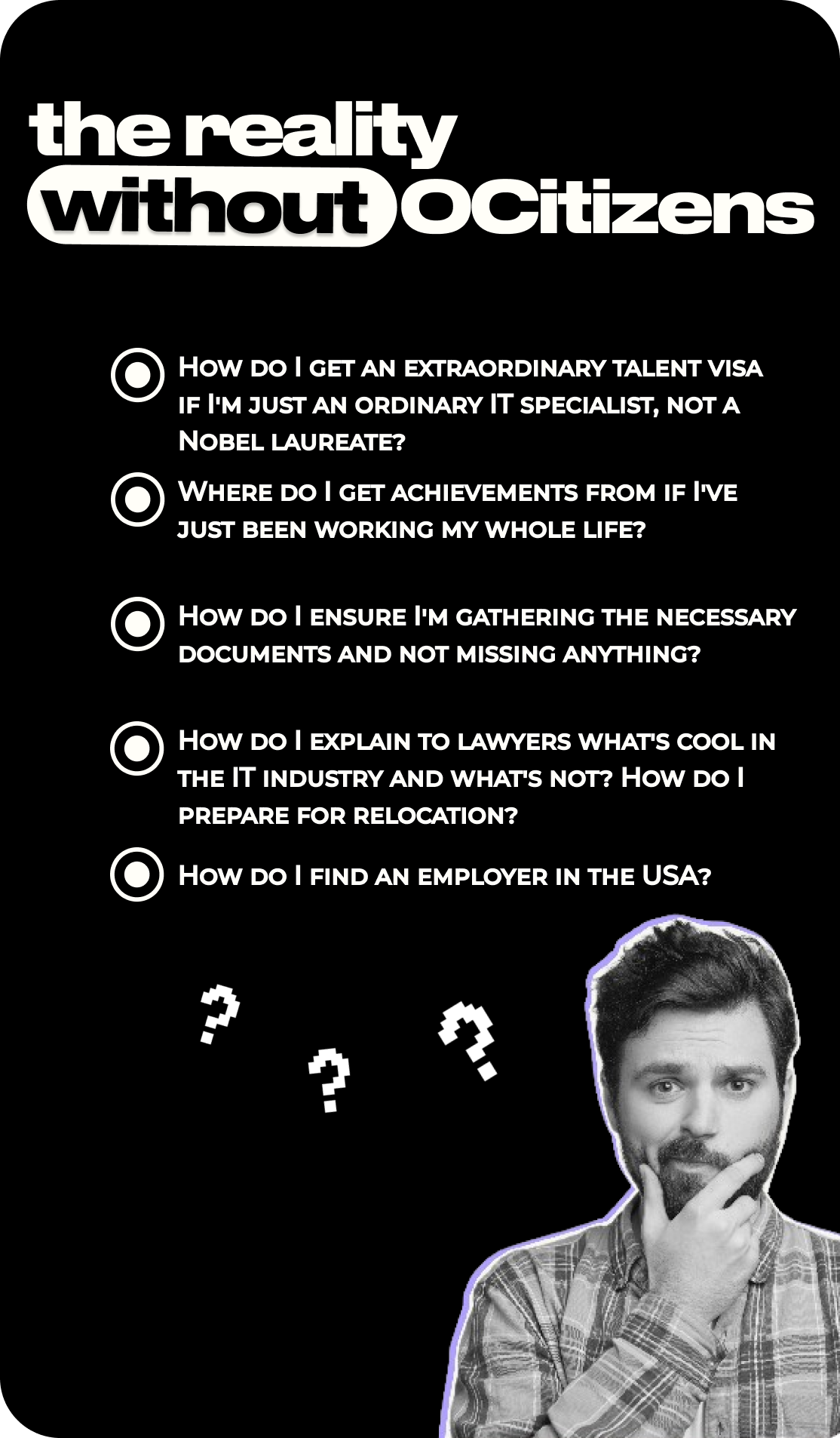 Ocitizens offers its support as a talent agency for professionals in the field of technology and entrepreneurship and fast tracking their O1 visa petitions. If you are a tech or creative professional in need of a sponsor for your O1 visa application, send us your resume for review. We recommend filing your O-1 visa through the agent or talents manager, since this will give you the ability to work on additional projects throughout the duration of your visa period. In this option, contracts between the employer(s) and the beneficiary are required; showing that actual positions exist and that the Only worker is coming to the United States to fill those