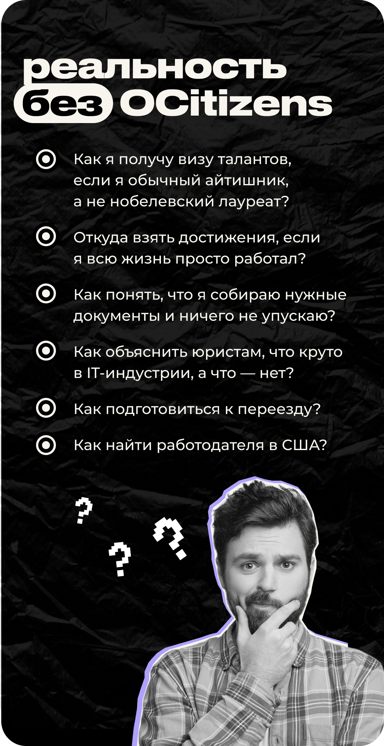 • разбираемся во всех 3 аспектах рабочей иммиграции IT-талантов: построение профессионального бренда, получение визы, поиск работы в США. А значит, мы можем ответить на вопросы, вроде «Как мне себя преподнести как эксперта, чтобы программный комитет конференции пригласил выступить в качестве спикера?» или «Как мне объяснить рекрутеру про мою визу, чтобы не спугнуть?». А также поможем с другими вопросами на стыке иммиграции, пиара и найма