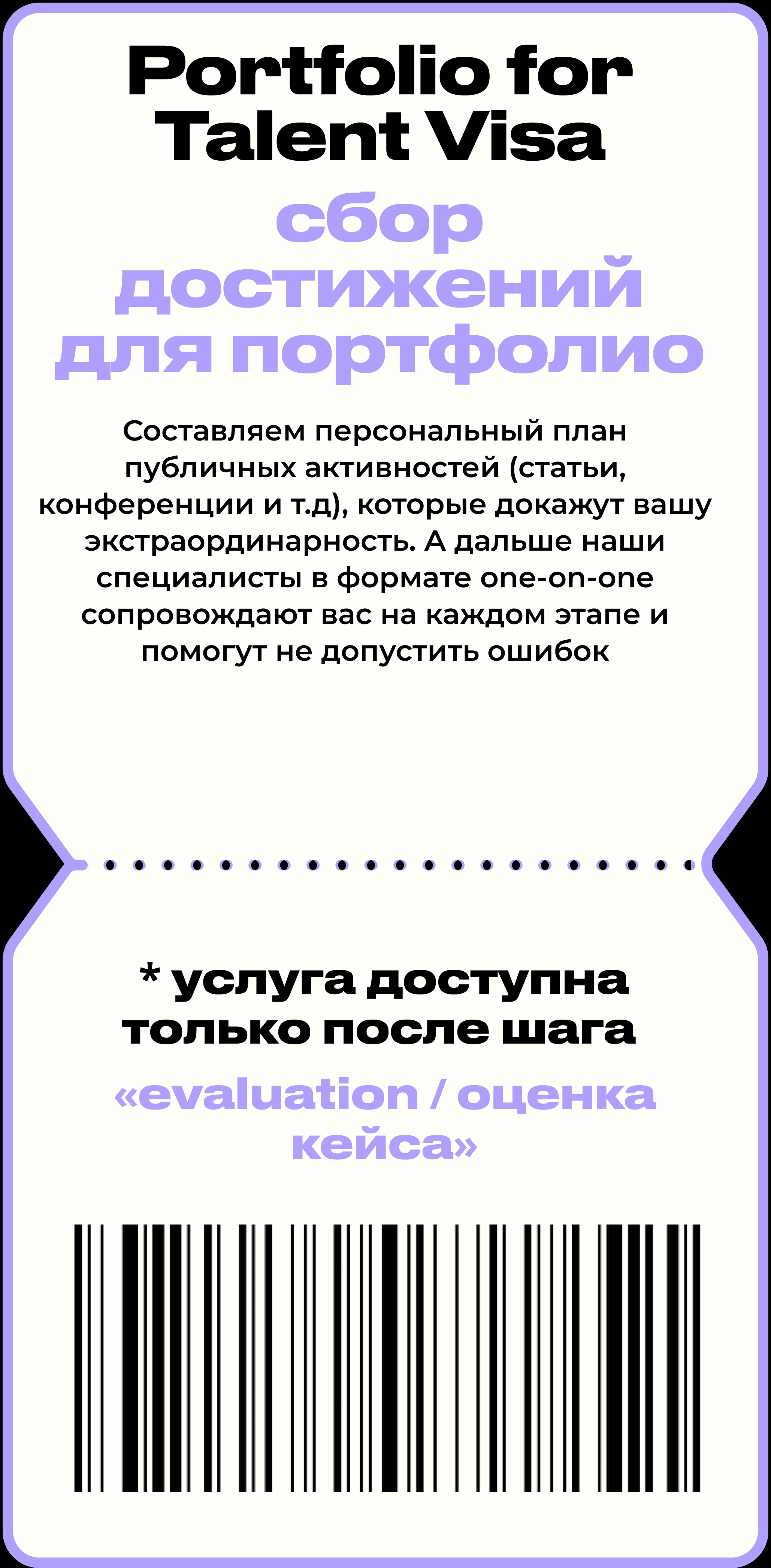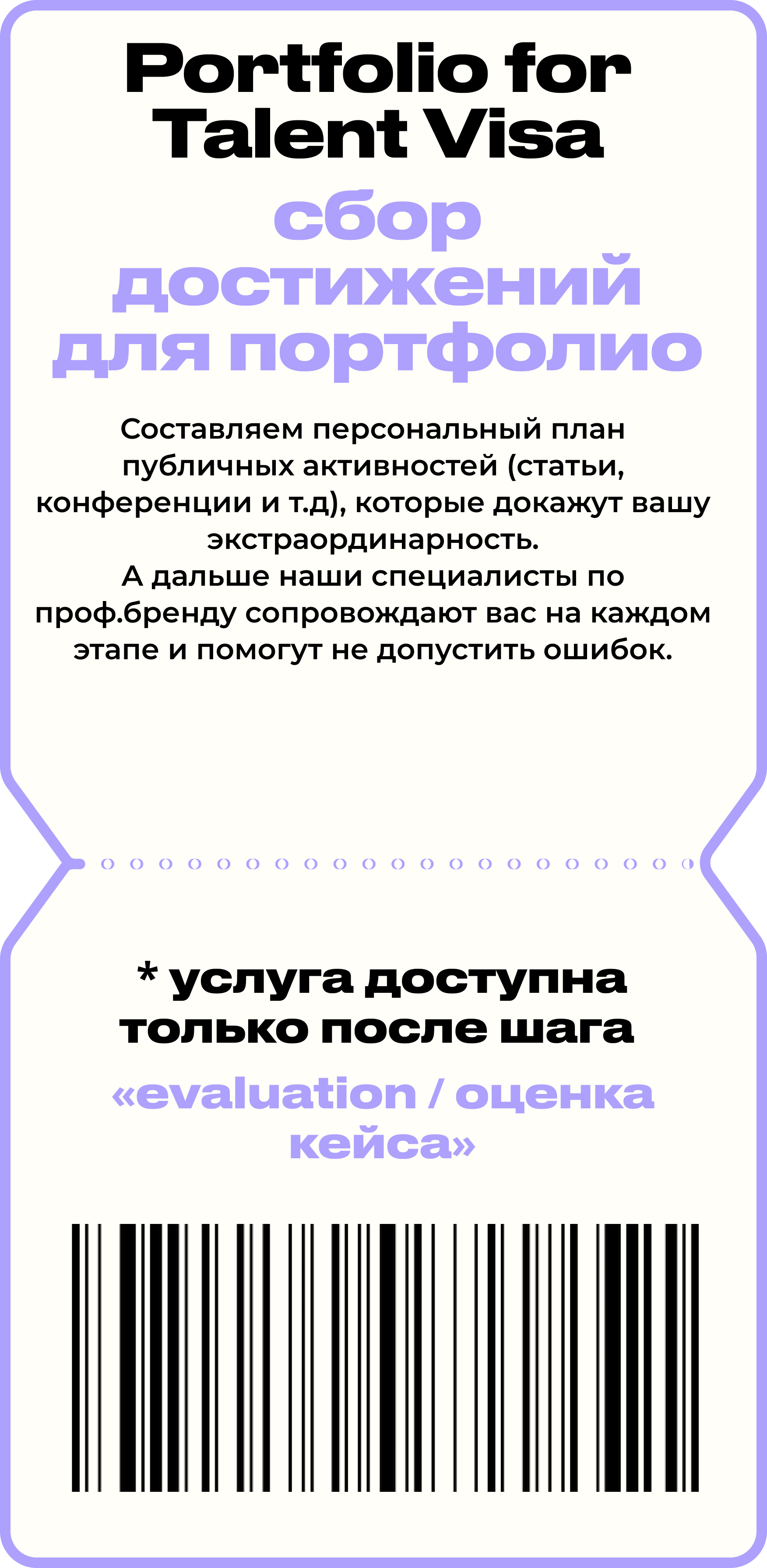 Вы получаете персональные рекомендации с общей расшифровкой, чтобы собрать сильное портфолио и составить кейс для визы таланта — для тех, кто решает двигаться дальше самостоятельно. Если решите продолжать с OCitizens, то переходим к следующему этапу.