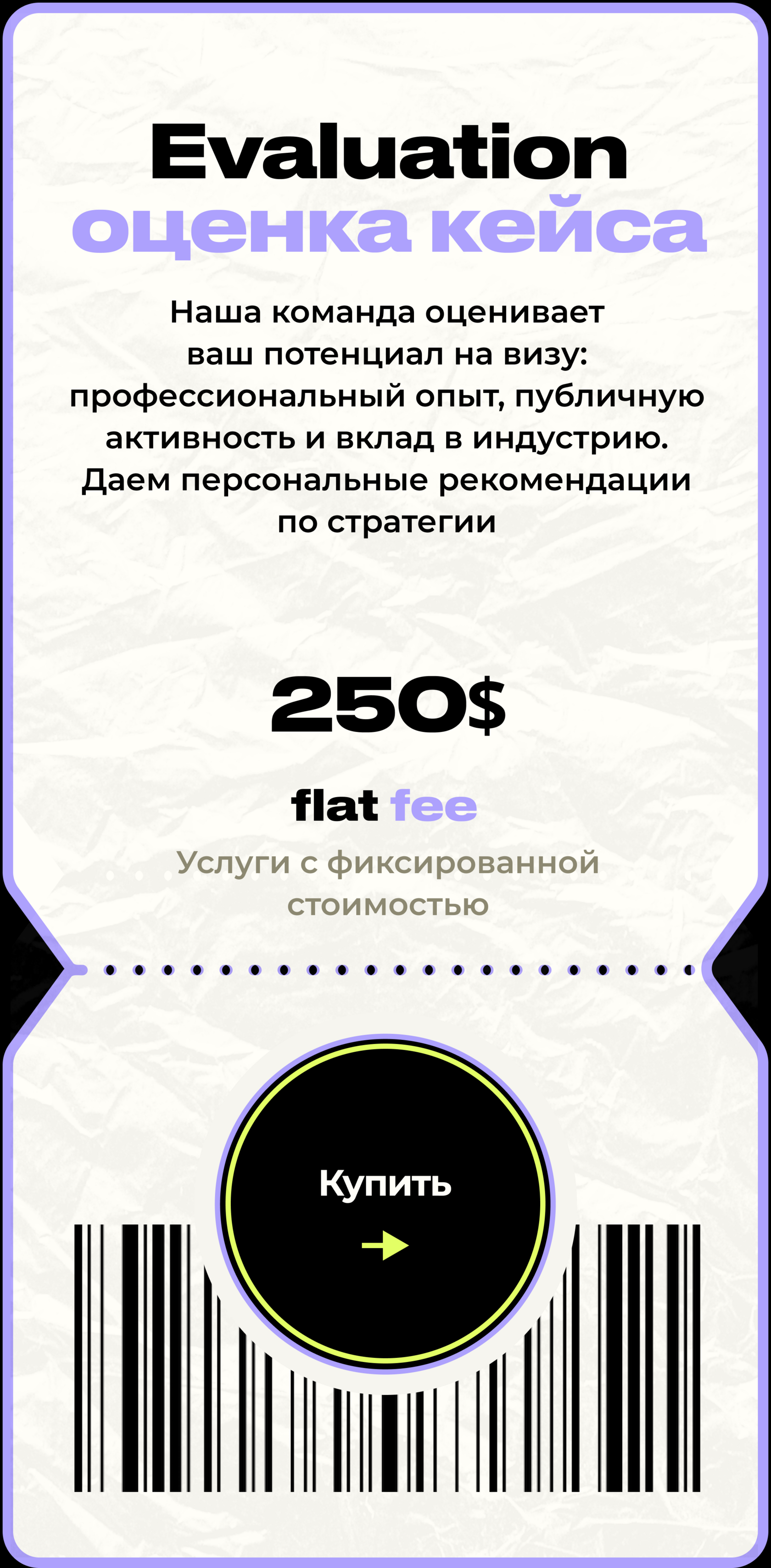 Наша команда оценивает ваши шансы на визы O-1 и EB-1: профессиональный опыт, публичную деятельность и вклад в индустрию. Составляем персональный список активностей, которые вам надо выполнить, чтобы подать петицию на визу и получить апрув