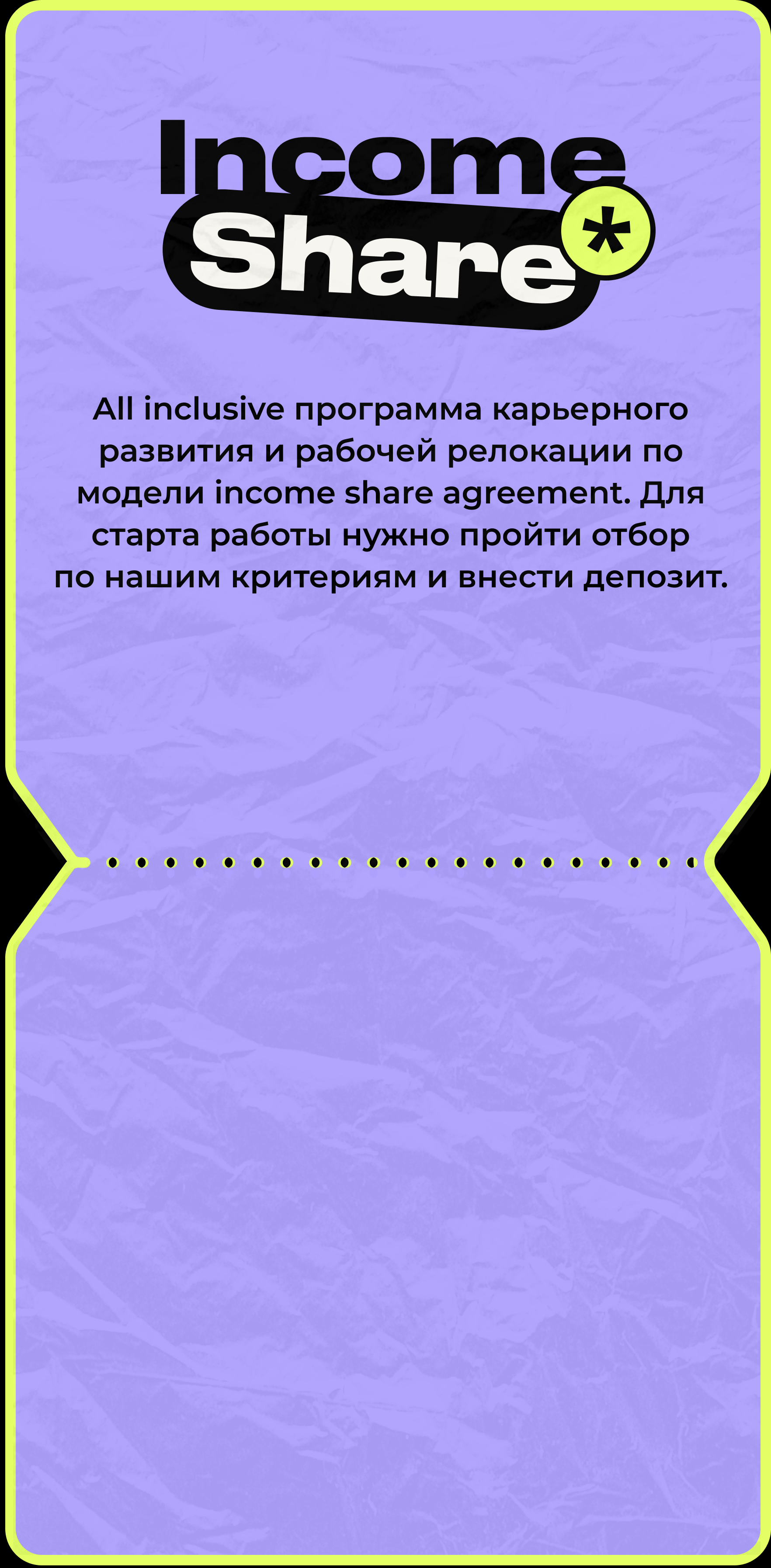 All inclusive программа карьерного развития и рабочей релокации по модели income share agreement. Для старта работы нужно пройти отбор по нашим критериям и внести депозит.