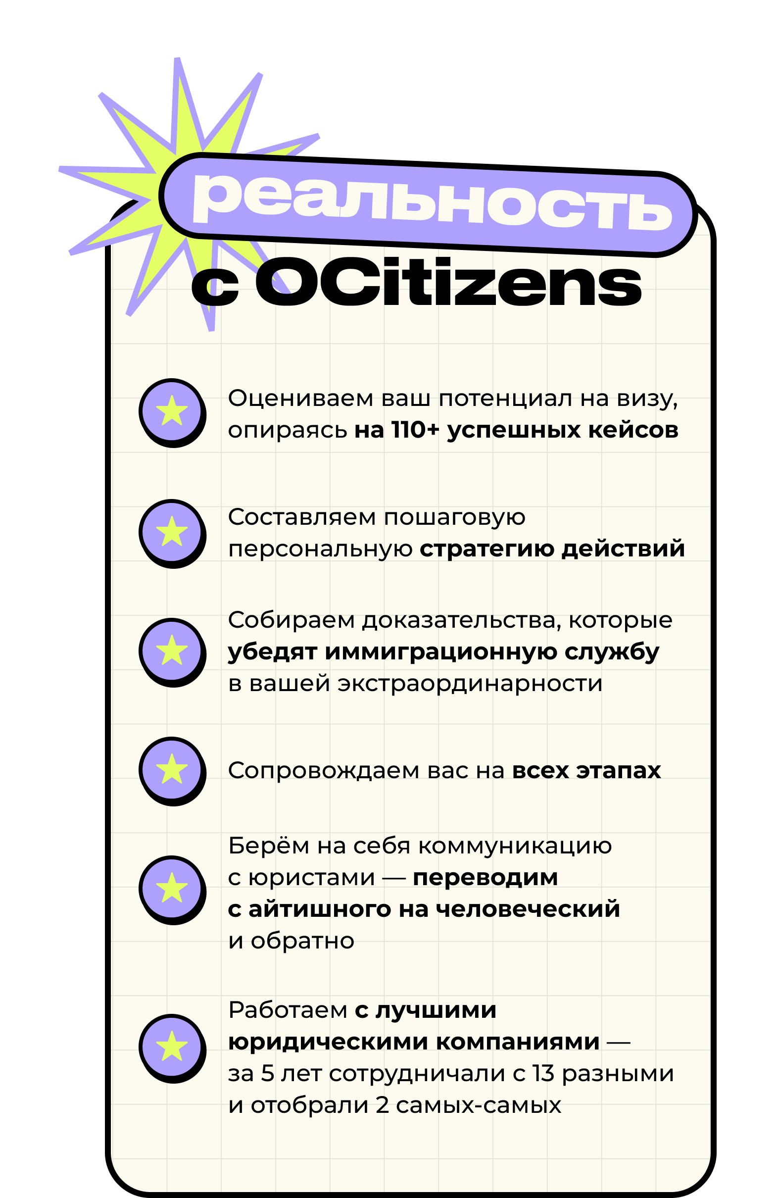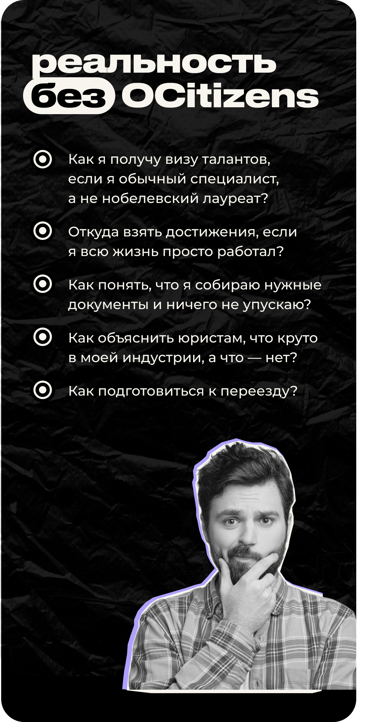 OCitizens — сервис релокации специалистов в США. Мы основали его в октябре 2019 и изначально работали только с представителями IT-профессий. Но мы росли, а вместе с нами росла наша экспертиза, поэтому сейчас мы работаем со всеми специалистами. Наша цель — доказать, что вы талант, какую бы визу вы ни выбрали.